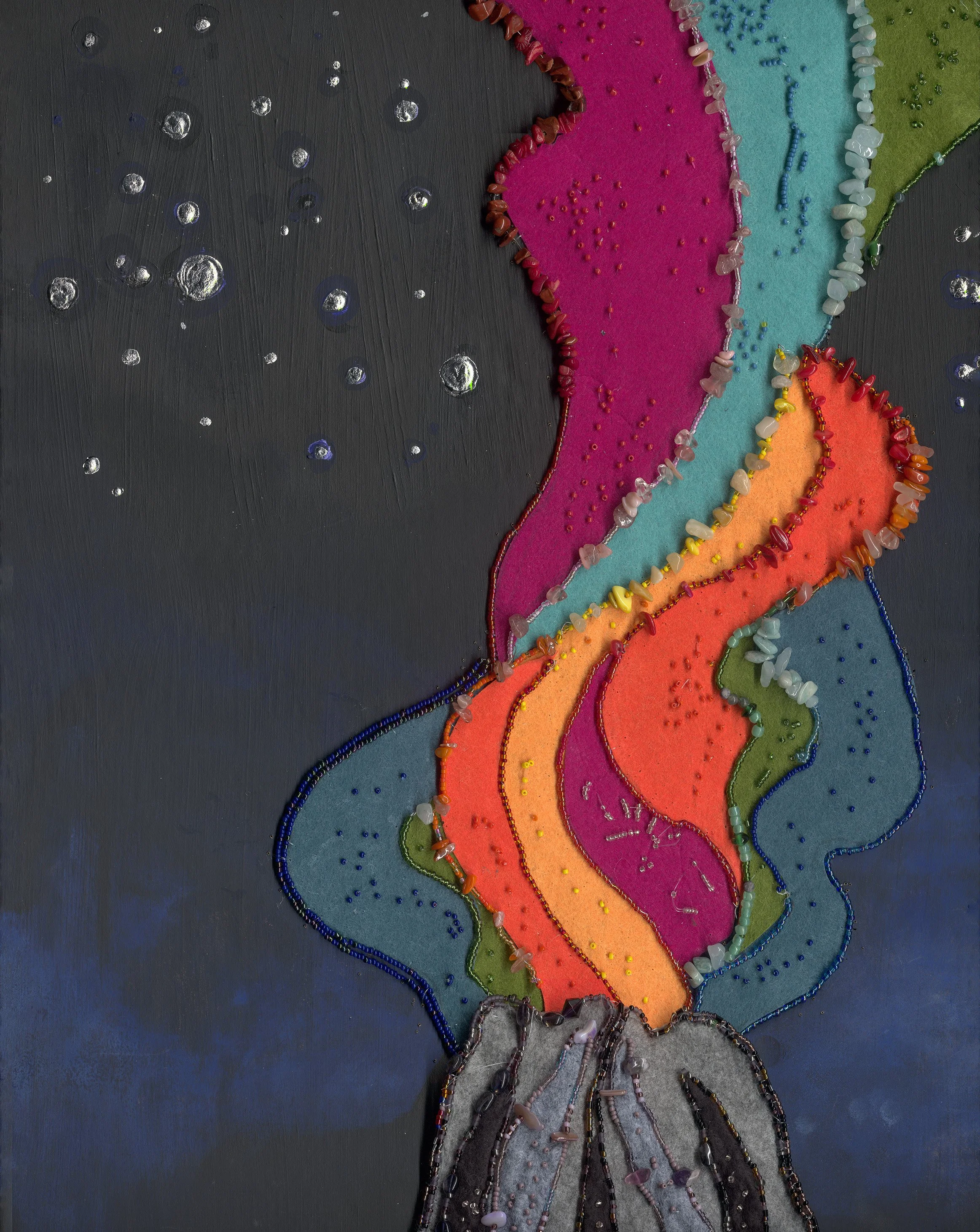 Using a combination of paint, fabric, glass, and beads, students built a richly textured composition that reflects both structure and movement. Fiber arts techniques play a central role: students practiced stitching beads directly onto fabric while also learning to string beads onto wire, creating contrast in form and dimension. The addition of glass elements enhances the sense of molten energy and transformation.